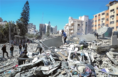3月19日,在加沙地带北部加沙城的一处社区,人们在以军袭击后的废墟中搜寻。 新华社发