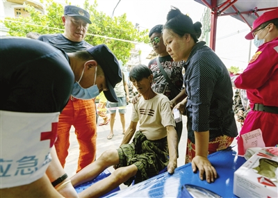 4月4日,在缅甸曼德勒皇宫附近的一处安置点,中国救援队队员为一名男子检查伤情。据缅甸广播电视台4日报道,缅甸强震目前已造成3301人死亡,4792人受伤,另有被报失踪人员200多人。