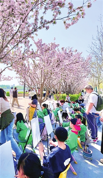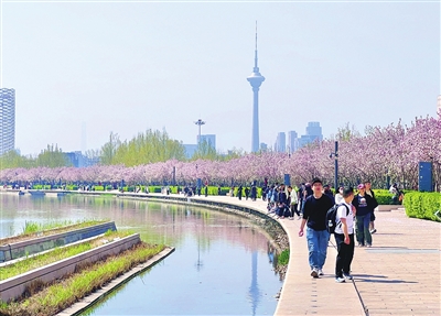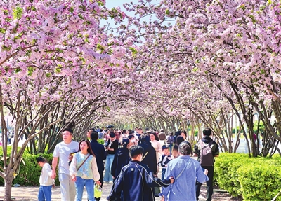 清明假期,天津文化中心海棠大道成片的粉色花海吸引众多游客前往赏花拍照。 记者 孙立伟 摄