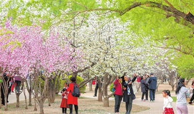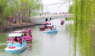 清明节期间,天津水上公园内梨花、海棠、碧桃等花卉竞相绽放,湖畔垂柳拂堤,成为众多市民出游踏青的好去处。