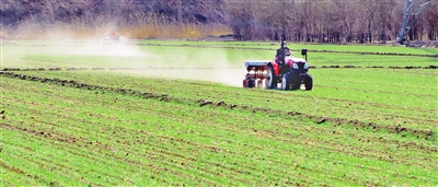 图为西青区杨柳青镇一冬小麦种植基地内农机施肥作业。