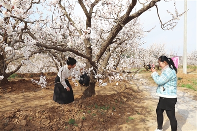 村里蜿蜒的河道旁,一座浮桥横跨碧水。刚刚过去的清明节假期里,每天众多游客在此举起手机定格漫天花雨,捕捉花海与人潮交织的瞬间。“这儿的杏花比别处开得早,花瓣也厚实,风一吹都带着甜味儿!”大家言语间均是兴奋与夸赞。