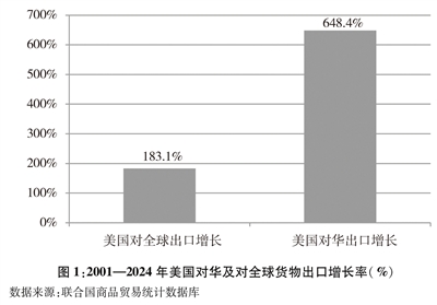 美国对华出口增速明显快于其对全球出口。中国加入世界贸易组织以来,美国对华出口快速增长,中国成为美国重要的出口市场。根据联合国统计数据,2024年美国对华货物出口额1435.5亿美元,较2001年的191.8亿美元增长648.4%,远远高于同期美国对全球183.1%的出口增幅(图1)。