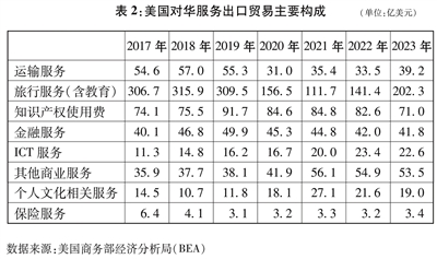 美国是中国服务贸易最大逆差来源地,逆差规模总体呈现扩大趋势。据美国商务部统计,2001-2023年,美国对华服务出口额由56.3亿美元扩大到467.1亿美元,增长了7.3倍;美国对华服务贸易年度顺差扩大11.5倍至265.7亿美元(图2),2019年时更是高达397亿美元。2023年,中国仍是美国服务贸易顺差最大来源国,占美国服务贸易顺差总额的9.5%左右,中国对美服务贸易逆差主要集中在旅行(含教育)、知识产权使用费和运输服务三个领域(表2)。