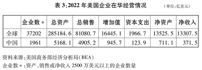 中美经贸合作为美国企业创造了大量商机和利润(表3)。中国拥有庞大的市场和不断升级的消费需求,例如,特斯拉在中国销量持续增长,2024年销量超过65.7万辆,同比增长8.8%,创下历史最高水平。十余家美资保险公司在华设有分公司。高盛、运通、美国银行、美国大都会人寿等美国金融机构作为中国金融机构的战略投资者,均取得了不菲的投资收益。美国商务部2024年8月的统计显示,2022年美国在华企业(拥有多数股权且资产、销售或净收入2500万美元以上)共1961家,总销售额4905.2亿美元,同比增长4.3%。