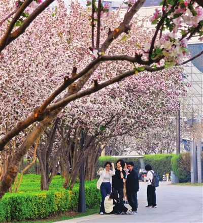1500米海棠步道闯入粉色梦境,天津文化中心的海棠步道已进入盛放期。绵延的粉色花带如云似霞,与现代建筑群交相辉映,吸引市民游客纷纷前来打卡。