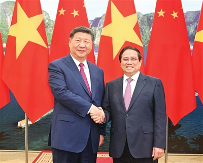 双方要推进高质量发展,为两国携手迈向现代化提供坚实战略支撑。充分发挥中越陆海相连的区位优势,加强发展战略对接,深挖产业合作潜能。稳步推进基础设施建设合作,提升互联互通水平,保障贸易畅通。做大做强贸易、投资等传统领域合作,拓展5G、人工智能、清洁能源、数字经济等新兴产业合作。坚定维护多边贸易体制,共同推动经济全球化朝着更加开放、包容、普惠、均衡的方向发展。