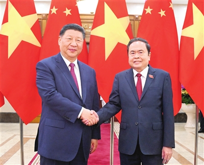 习近平指出,中国全国人大和越南国会交往互动频繁,合作成果丰硕。两国立法机构要在加强传统友好、保障务实合作落地、强化多边协调方面多做工作,就各自国家社会主义民主法治建设开展交流,不断丰富中越命运共同体内涵。