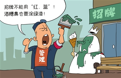 河北省三河市城管部门要求商户门头牌匾禁用红、蓝、黑底色,给商户带来很大困扰。目前,三河市委主要负责人已被免职处理。城市治理,不能光看“面子”是否光鲜,更要看是否让群众安居乐业。 王宇 画