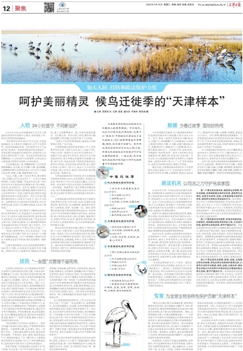 在谈到科学保护方面时,闫春财向记者介绍,依托鸟类监测站、智能监控系统和卫星追踪技术,天津建立起候鸟迁徙规律研究网络系统,并对东方白鹳、遗鸥等濒危物种实施专项保护。此外,通过爱鸟周、观鸟节等公众科普教育活动和国际合作(如北大港湿地列入“国际重要湿地名录”),天津构建了全社会参与的护鸟氛围,每年吸引超百万只候鸟过境,湿地生物多样性显著提升,形成良性生态循环。天津的候鸟保护措施,为全球生物多样性保护贡献了“天津样本”。