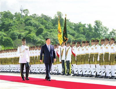 习近平乘车抵达时,易卜拉欣和马来西亚总理安瓦尔在下车处热情迎接。两国元首登上检阅台,军乐团奏中马两国国歌,鸣礼炮21响。习近平检阅仪仗队。两国元首进入国家王宫大厅,同双方陪同人员握手致意。