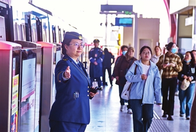 李妍君是津静线团泊医学园站值班站长,家住团泊湖东区,津静线让她上班之路变坦途。开通前她要先开车到距离外环线最近的地铁站,停好车,再换乘地铁上班。津静线通车后,使她到职场的通勤“缩圈”啦!图为李妍君在站台疏导乘客。