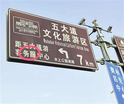 在河北区金钟河大街与外环东路交口,一块红底白字的“天津黄崖关长城风景游览区”景点指示牌表面已经开裂、污损严重,难以辨别内容;在东丽区金钟公路大毕庄段,一块标注着“东丽湖度假区”字样的指示牌,文字上方的信息大面积脱落,成了“大白脸”,无法辨认具体内容;在南开区宾水西道由东向西方向,宾悦桥桥口,一块“五大道游客服务中心”指示牌上的“服务”二字错写成“务服”。这些指示牌均位于车流量较大的主干道上,原本是为游客指引方向,如今不仅识别度低,还有损城市形象。