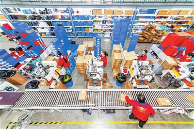 图为4月20日,工作人员在对发货鞋类产品进行分拣、打包。