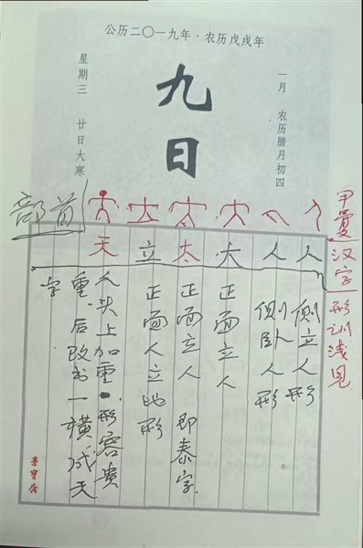 我小心翼翼地翻开这本手稿。从2019年1月9日开始,马老正式动笔创作他的“说文解字”。在“一月九日”页的右侧,他用红笔划了三格:分别写着甲骨文、汉字、形训浅见。正文开篇第一页,马老从右往左写下了“人、人、大、太、立、天”六个字,对于这六个字,马老先写出每个字的甲骨文样态,再写出现在的汉字形态,之后又写出他对每个字的解释。譬如:人,侧立人形;人,侧卧人形;大,正面立人;太,正面立人,即泰字;立,正面人立地形;天,人头上加重,形容贵重,后改书一横成天字。