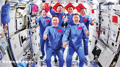 4月25日在北京航天飞行控制中心拍摄的神舟二十号航天员乘组和神舟十九号航天员乘组“全家福”。 新华社发
