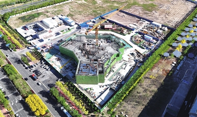 走进中新天津生态城绿创中心项目施工现场,机械轰鸣、吊臂挥舞,施工现场180余名施工工人和管理人员紧张有序地进行着钢筋绑扎、混凝土浇筑、钢结构安装等作业,呈现出一片火热的建设场景。
