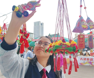 现场,杨柳青木版年画、泥人张彩塑、达仁堂传统蜜丸制作技艺、益德成闻药制作技艺以及全市16个区的代表性非遗项目汇聚于此,包含美术、技艺、美食、养生等多类别,生动展现了非遗融入现代生活的功能性和实用性。在泥人张彩塑展台前,《五虎上将》等作品展示出泥人张彩塑技艺创作题材广泛、用色简雅明快等特色;在巧妹红妆绳艺展台前,该非遗项目代表性传承人吕敏制作的传统文化元素挂饰色彩艳丽,令人眼前一亮;在天津葫芦制作技艺摊位前,造型丰富、具有实用性的葫芦产品令人爱不释手。