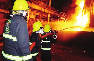 图为消防员在也门荷台达省巴吉勒区遭受空袭的一家水泥厂灭火(视频截图)。