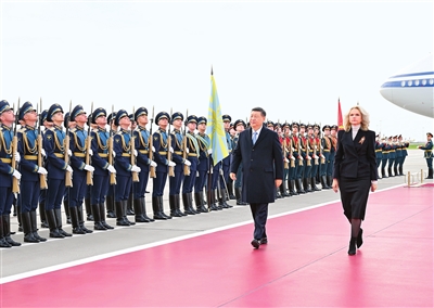 俄方在机场举行隆重迎接仪式。军乐团奏中俄两国国歌。习近平检阅仪仗队并观看分列式。
