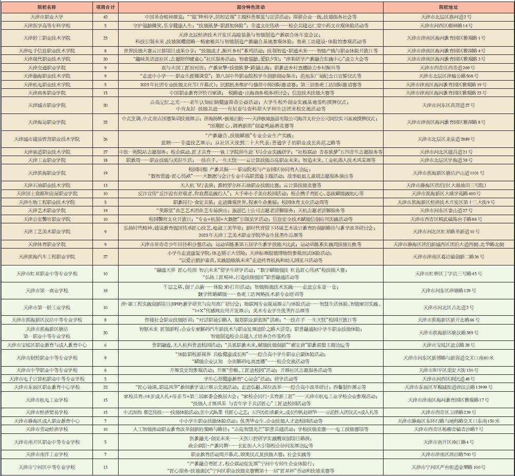 天津市于2025年5月11日举行2025年职业教育活动周启动仪式。天津市教育委员会会同天津市教育科学研究院、相关职业院校、行业企业,举办“世界职业院校技能大赛经验交流”“职教发展研讨”“职普融通体验”“产教融合示范”“职教出海展示”“技能人才风采”“职教志愿服务”等系列主题特色活动。作为国家现代职教改革创新示范区、创新发展标杆、模式探索先行区,天津坚持教育科技人才一体化发展,深化职普融通、产教融合、科教融汇,推动科教兴市人才强市行动取得更大成效,在教育强国建设中开创天津职业教育高质量发展新局面,为谱写中国式现代化天津篇章提供有力支撑。