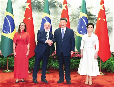 5月13日下午,国家主席习近平在北京人民大会堂同来华进行国事访问的巴西总统卢拉举行会谈。这是习近平和夫人彭丽媛同卢拉和夫人罗桑热拉合影。 新华社记者 黄敬文 摄