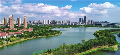 昨日,蓝天白云映衬下的梅江公园风景如画。 记者 潘立峰 摄