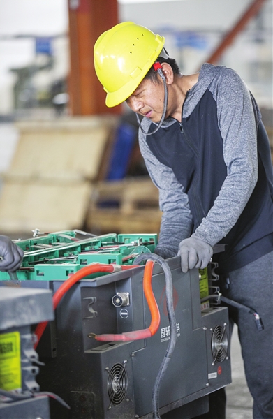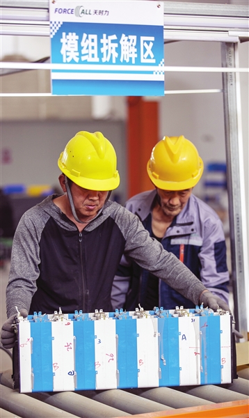 动力电池拆解工杨华义是天时力拆解车间的老师傅,他一天“过手”的电池包不到10个。“新能源汽车动力电池小的重100多公斤,大的重700多公斤。”他告诉记者,车间现在拆解的这批电池是从北京汽车集团有限公司收来的。去年市场上电池惜售,今年回暖了一些。