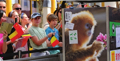 5月14日,在比利时布吕热莱特,人们欢迎来自中国的三只金丝猴抵达天堂动物园。这三只金丝猴为一雄两雌,来自陕西秦岭大熊猫研究中心。入园后,它们将封闭式栖居于园方特意准备的一座中国风格的楼阁建筑中,完成一个月的检疫隔离后与公众正式见面。 新华社发