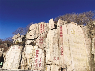 泰山石刻,不少是隽永、简略的对眼前风景的文学性赞美,也有游客抒情言志的内容。有一处汉隶字体石刻,是书写者自励并鼓励其他游客的句子:“愿同胞努力前进,上达极峰,独立南天门,高瞻远瞩,捧日拿云,可以张志气,拓胸襟,油然生爱群救世之心,感斯山之永固兮。国家柱石,曰严曰峻,威然吾民族之威积。”书写者在登山途中生发爱国主义情怀,将自己的即兴感怀深深地镌刻在山壁上,时间是1929年。