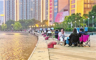 傍晚,海河水面波光粼粼,两岸建筑流光溢彩,不少市民来到海河畔赏景休闲,享受惬意时光。 记者 孙立伟 摄