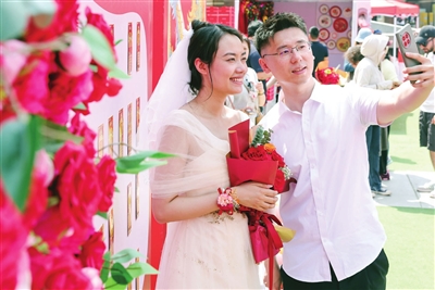 昨日,西青区民政局举办集体颁证活动,新人们纷纷在创意打卡点拍照留念。 记者 潘立峰 摄