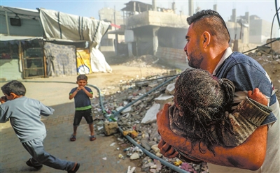 5月21日,在以军空袭加沙地带北部杰巴利耶难民营所在区域后,一名男子抱着受伤的儿童寻求救援。