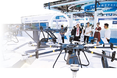 图为在第九届丝绸之路国际博览会暨中国东西部合作与投资贸易洽谈会低空经济展上,参观者了解各类飞行器。