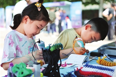 孩子们用3D打印笔绘制立体画。