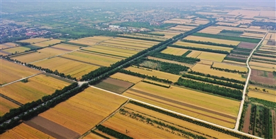 时下,山西省运城市430余万亩小麦陆续进入收获期,田间麦浪滚滚,遍地金黄。图为山西省运城市盐湖区田园景色(5月23日摄,无人机照片)。 新华社发