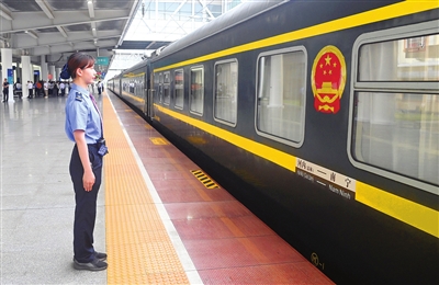 5月25日,工作人员在南宁站为准备开行的列车执勤。