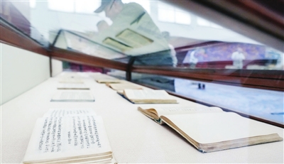 图为参观者在仪式现场观看新四军老战士沈如峰的战地日记等物品(5月26日摄)。 新华社发
