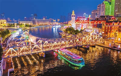 当夜幕降临,海河宛如一幅绚丽的光影画卷,游船穿梭,灯光与水波相互映衬,如梦如幻。