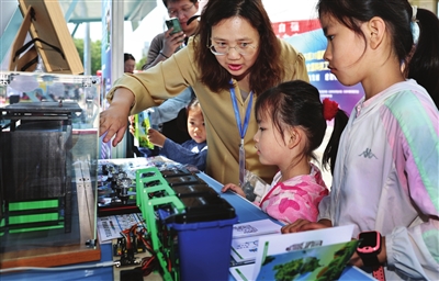 在天津全域科普展览展示活动上,孩子们在了解“听话的垃圾桶”。