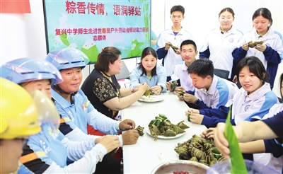 日前,红桥区芥园街世春里社区联合区工会和复兴中学在户外劳动者驿站开展“粽香传情”主题活动。 记者 孙立伟 摄