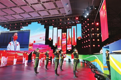 伴随全场合唱《歌唱祖国》的歌声,6名护旗手迈着坚定的步伐,护卫着中华人民共和国国旗走进会场。全体起立,高唱中华人民共和国国歌。五星红旗冉冉升起。