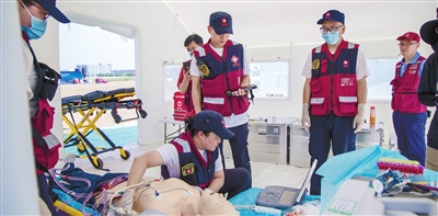 本次演练设计背景为多日强降雨在京津冀三地交界处的平谷山区引发山体滑坡和泥石流等自然灾害,出现大量人员伤亡,伴发多个衍生事件。按照整体演练部署,由本次演练任务执行队长徐阳带领队员们,参与8名伤员的实战救治演练工作。对于轻症患者,队员们接诊后,对其伤口实施清创缝合包扎处置。对重症患者,立刻开展生命体征监测,血液检测及影像学检查,明确诊断为“挤压综合症”后,立刻给予紧急截肢手术处置。对危重症患者,队员们通过心肺复苏、体外膜肺氧合系统(ECMO)治疗、血气检验及床旁超声检查等措施,待生命体征平稳后,转运至后方医院进一步救治。整个救治过程规范流畅、紧张有序。