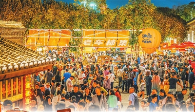2日晚,游客在河北省唐山市丰南区河头老街景区游玩。 新华社发