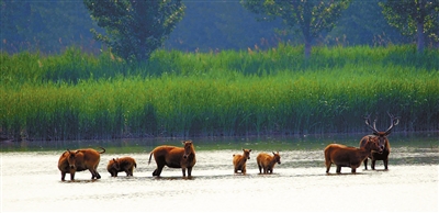 “让野生动物返回它们祖先曾经繁衍生息的地方,在专业上叫做‘重引入’。对于麋鹿‘重引入’种群,‘吃饭’和‘生娃’分别关乎其生存和未来,体现着种群在自然生境中的适应情况。”天津师范大学野生动物资源保护研究团队负责人赵大鹏教授表示,近年来的研究结果显示,麋鹿天津重引入种群食谱较广,主要取食禾本科、菊科、旋花科等多科数十种植物,其中代表“菜品”包括芦苇、苦荬菜、圆叶牵牛、葎草、荇菜等,该食谱存在比较明显的个体偏好、季节变化与年间差异,麋鹿种群整体健康状况良好。而且,该种群在回归自然后连续4年繁育,每年的新生个体都是重引入种群发展壮大的新力量。麋鹿在取食和繁育方面的表现,反映了重引入种群适应自然生境的良好能力。