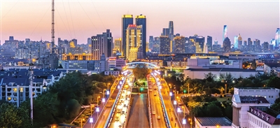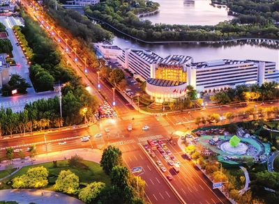友谊南路夜色中的津典时代广场(左)和莲花酒店(右)如同璀璨的明珠