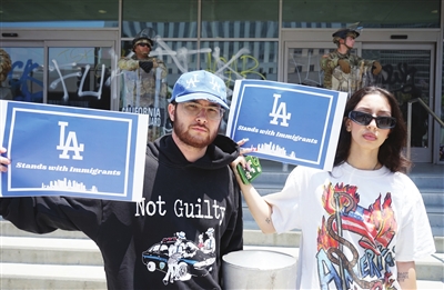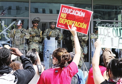 6月9日,在美国加利福尼亚州洛杉矶一处联邦机构建筑外,示威者与国民警卫队人员对峙。 新华社发