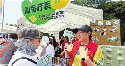 近日,在2025年天津市全民健康素养宣传月暨健康中国行现场活动中,天津医学高等专科学校的宣传台前,中药知识分享、中药茶饮和香囊体验等受到市民青睐。