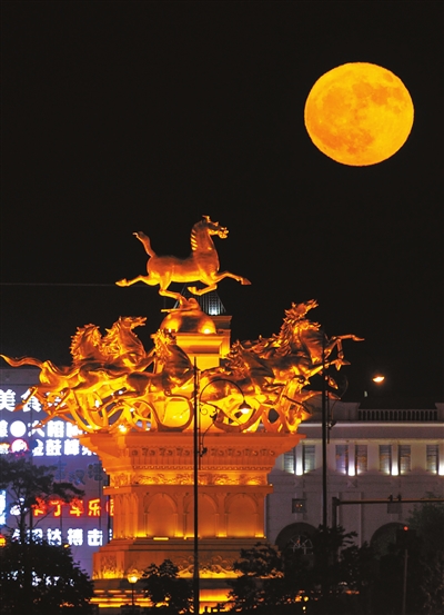 图为在黑龙江省牡丹江市江滨公园拍摄的满月。
