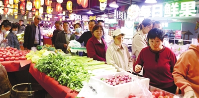 “以前买菜得去较远的地方,现在出小区过条马路就到这个市场了,我们家每天三顿饭都离不开这里。除了蔬菜、水果,市场里还有很多小吃,很有特色。市场里‘你买菜 我帮炒’的餐饮模式,对于我这样不擅长做饭的人或者忙碌的双职工家庭来说,简直太方便了。”日前,记者跟随刘阿姨来到了位于天津南站片区的大福圆市集·枫雅道菜市场。进入市场,令人瞬间感受到古风与现代混搭的独特风格,卖场入口影壁墙上镶嵌的大尺寸智慧显示屏,方便顾客提前了解市场内果蔬的溯源情况、当日检测结果和市场实时交易量等动态信息。“今年4月,新建的大福圆市集·枫雅道菜市场正式运营,占地面积2600平方米,分为蔬菜水果区、活鱼水产区、美食区。现场制作的西北角老味牛肉饼、凉皮、酥饼、饮料等都是人气较旺的商品。菜市场还为前来购物的市民提供洗切一条龙、自助称重等多样化便民、利民的延伸服务。”菜市场负责人唐伟介绍说。“该菜市场开业,让南站片区居民‘买菜难’的问题迎刃而解,也让该区域的宜居指数再提升。”西青区商务局相关负责人表示,大福圆市集·枫雅道菜市场的建成可惠及周边4个社区约2万名居民,更好满足附近百姓“菜篮子”需求。